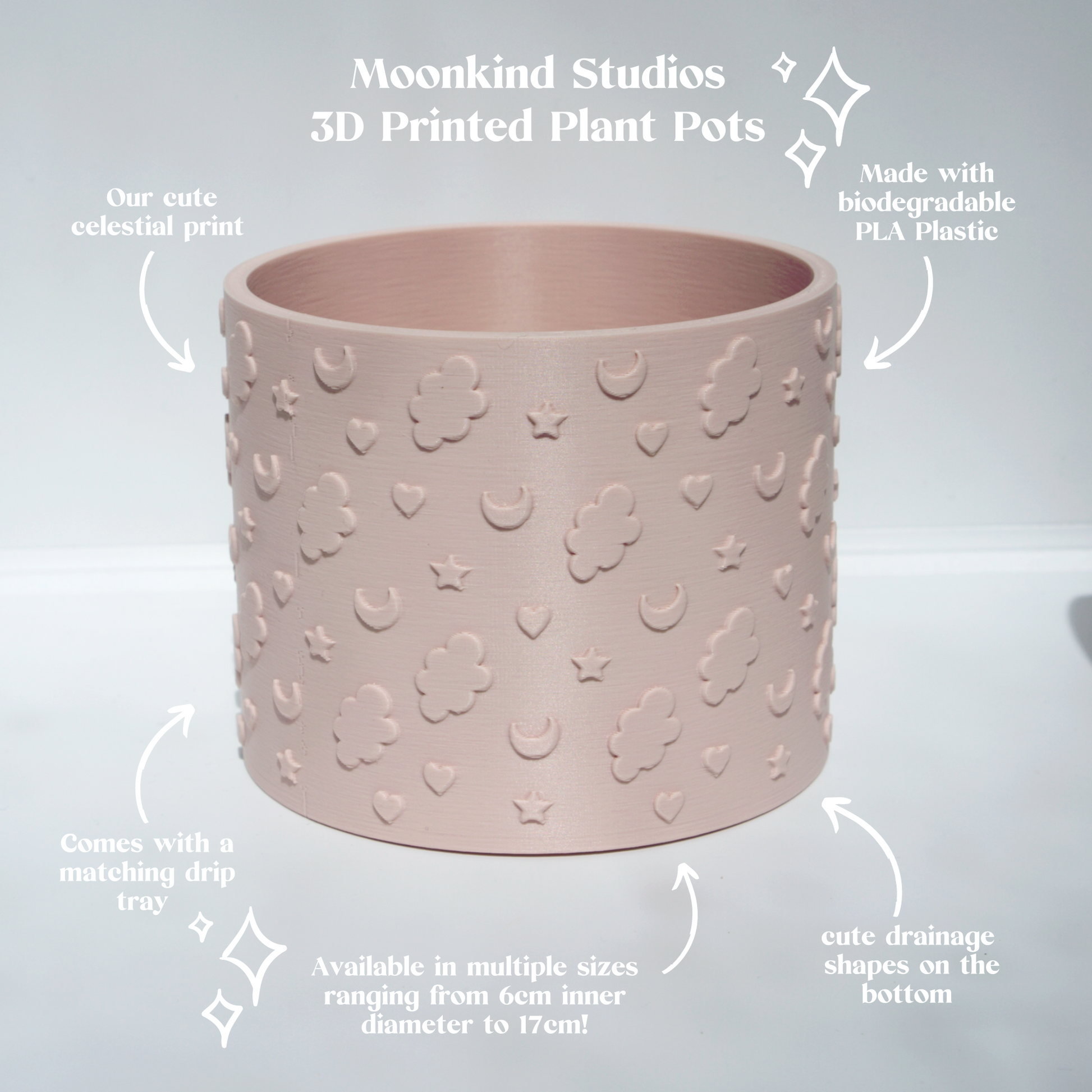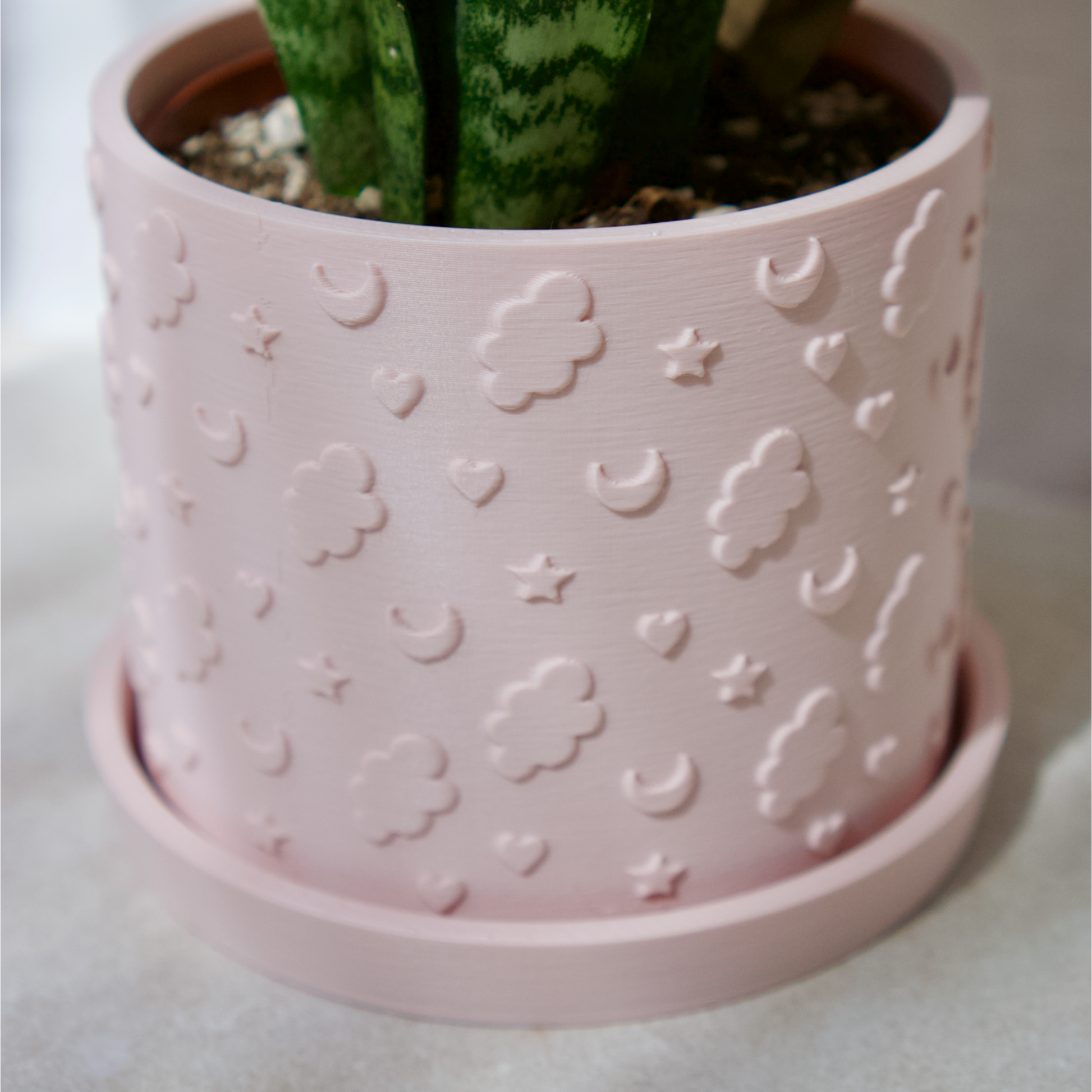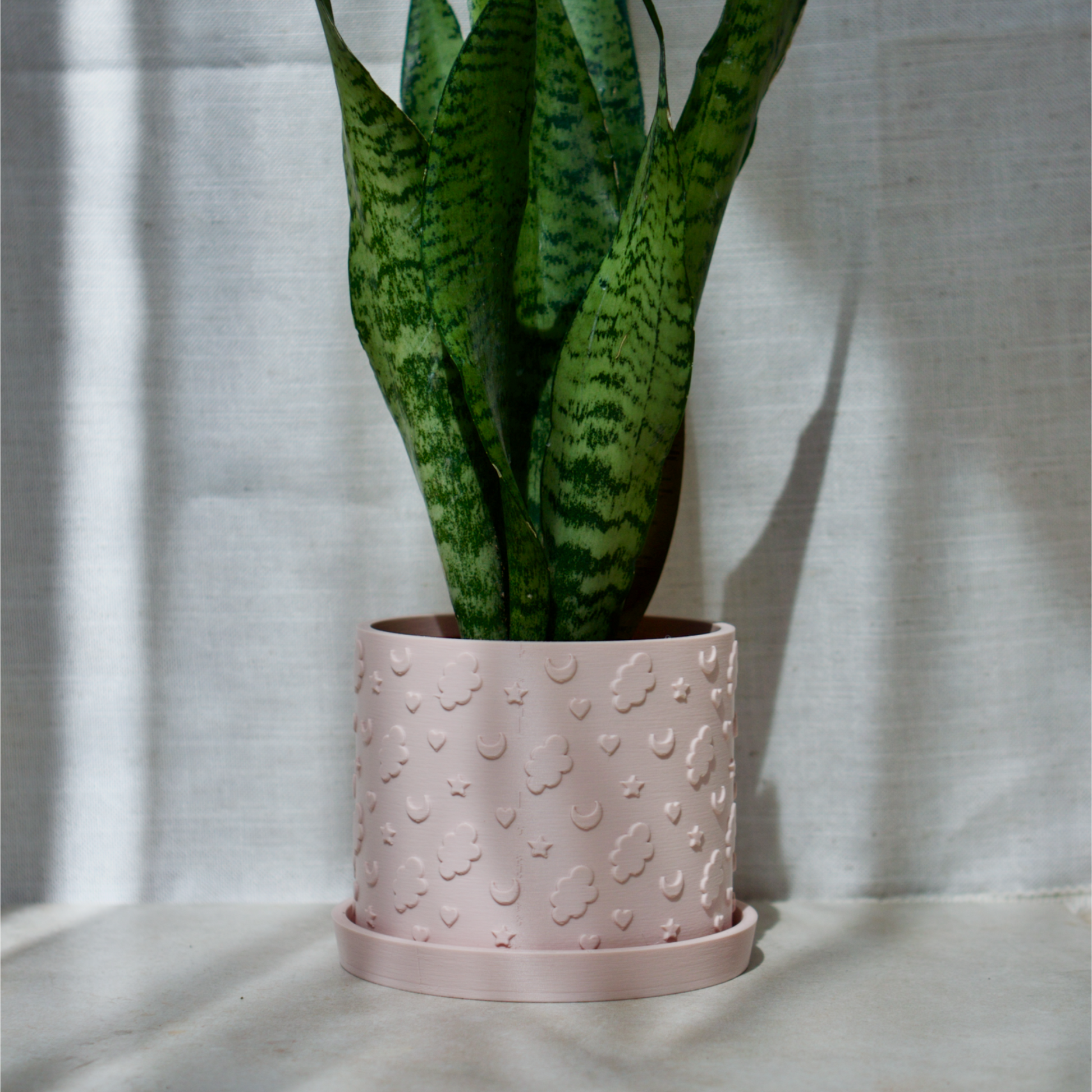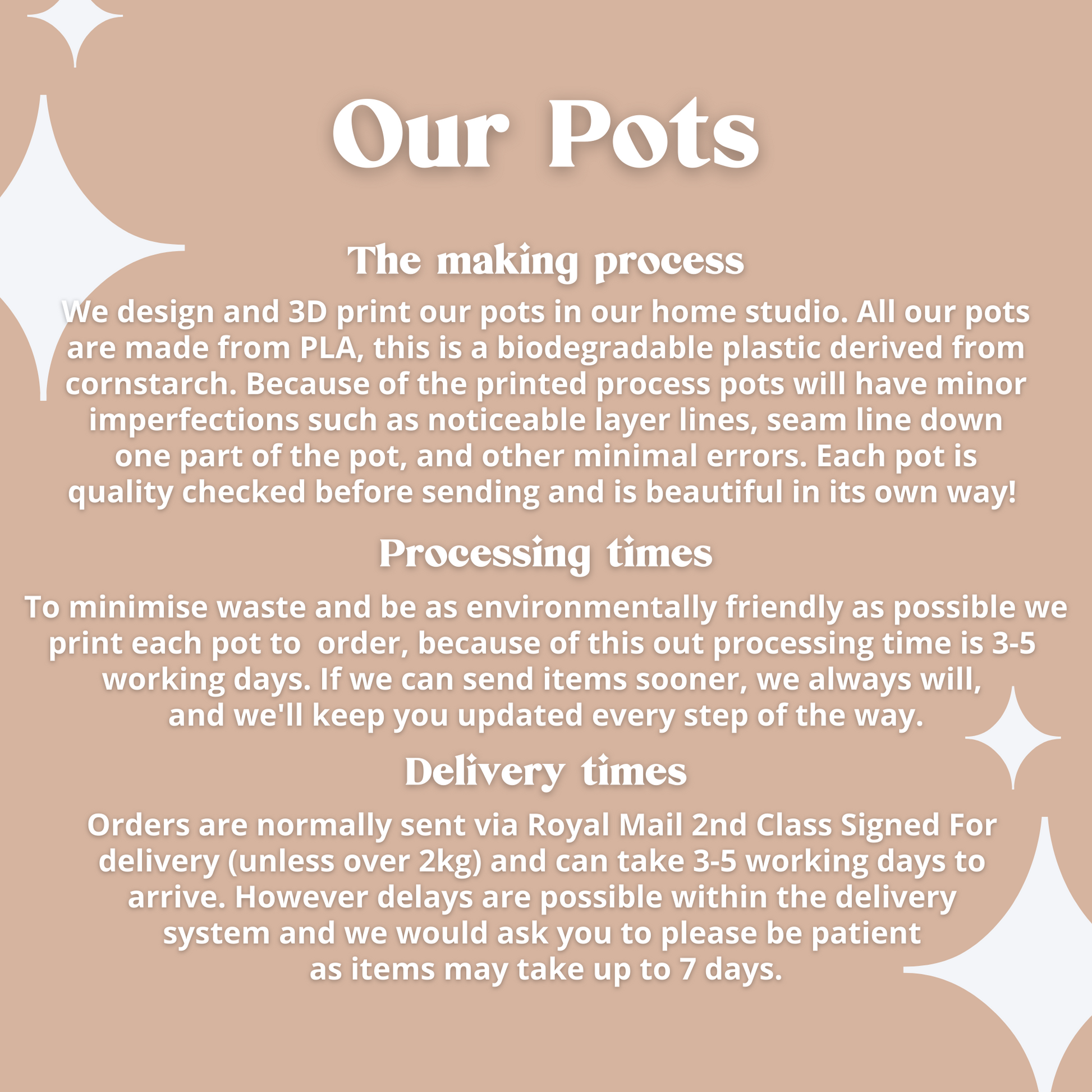 Our planters are designed and custom made solely by me in my home studio. Due to the 3D printing process there are likely to be some minor imperfections on finished products. Each pot has layer lines and a seam line that runs down the back of the pot, and sometimes the printer has a little wobble that can cause minor imperfections, but I like to think these all add to the beauty and uniqueness.