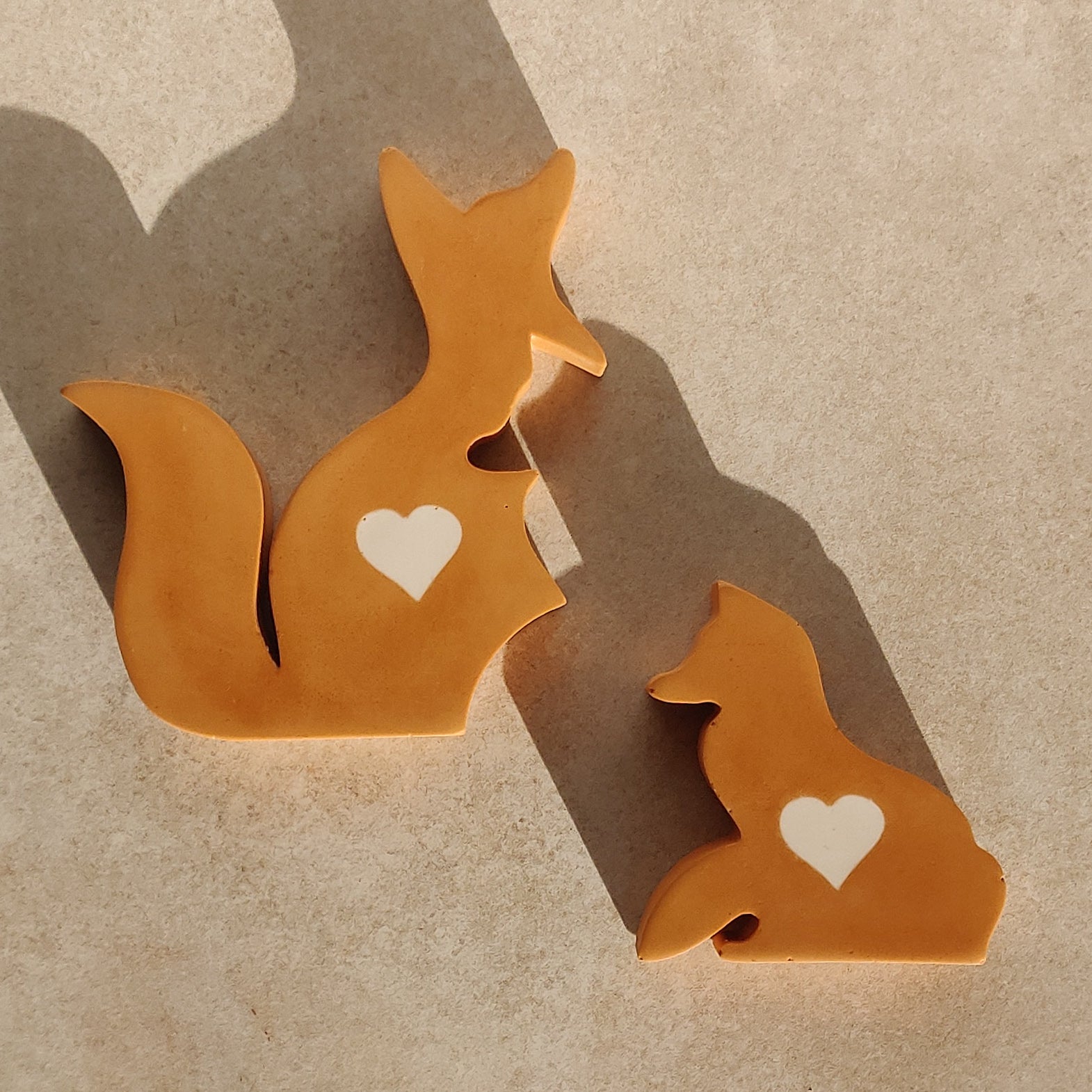 Large Fox: 10cm (height) x 9.5cm(width) x 2cm (depth) / Little Fox: 6.5cm (height) x 5.5cm (width) x 2cm (depth)