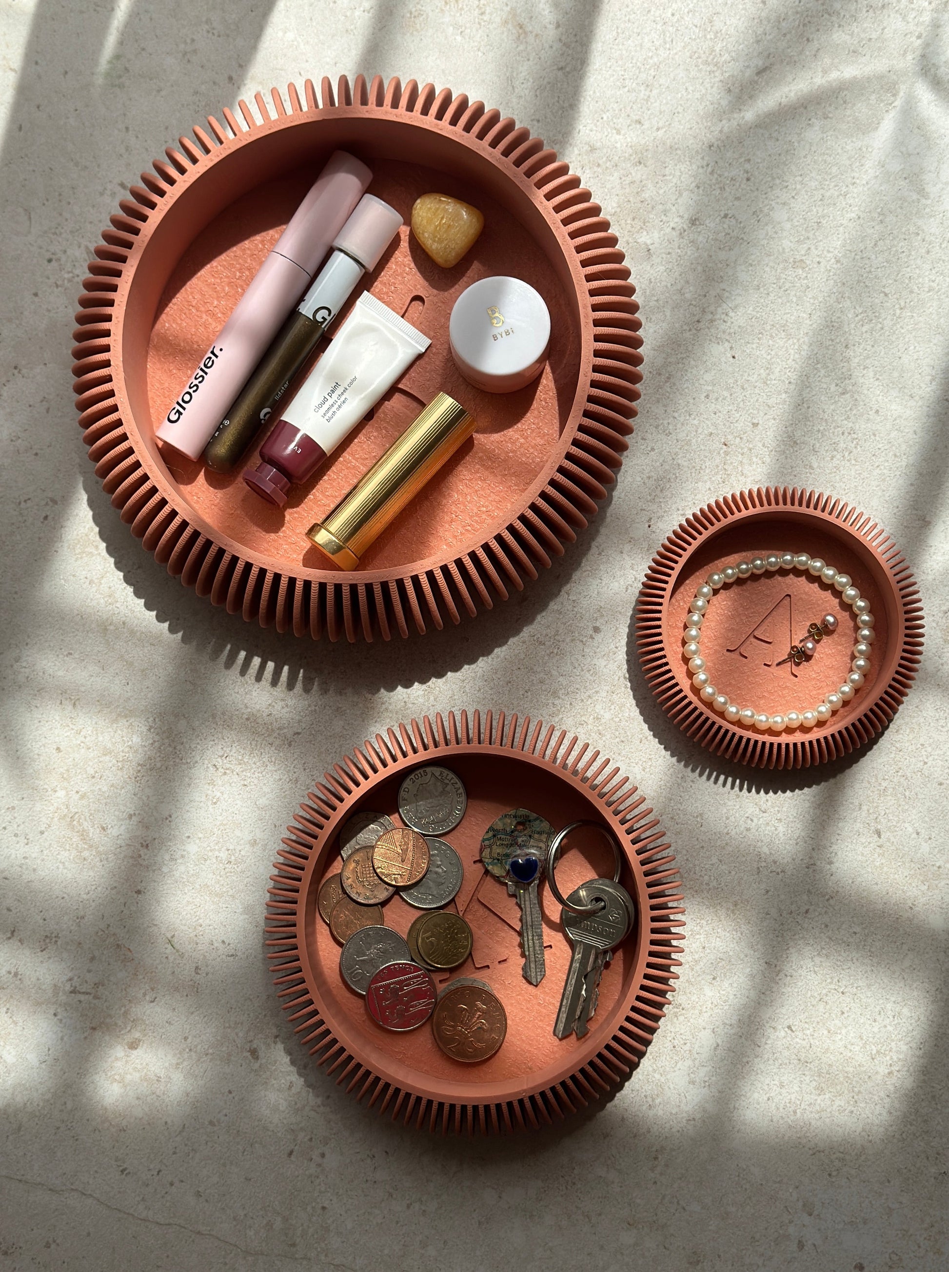 Perfect for organising jewellery, keys, coins, makeup, electronics, office stationery and more, our stackable dishes are 3D printed and designed to slot together perfectly. So you can keep stacking to the skies!