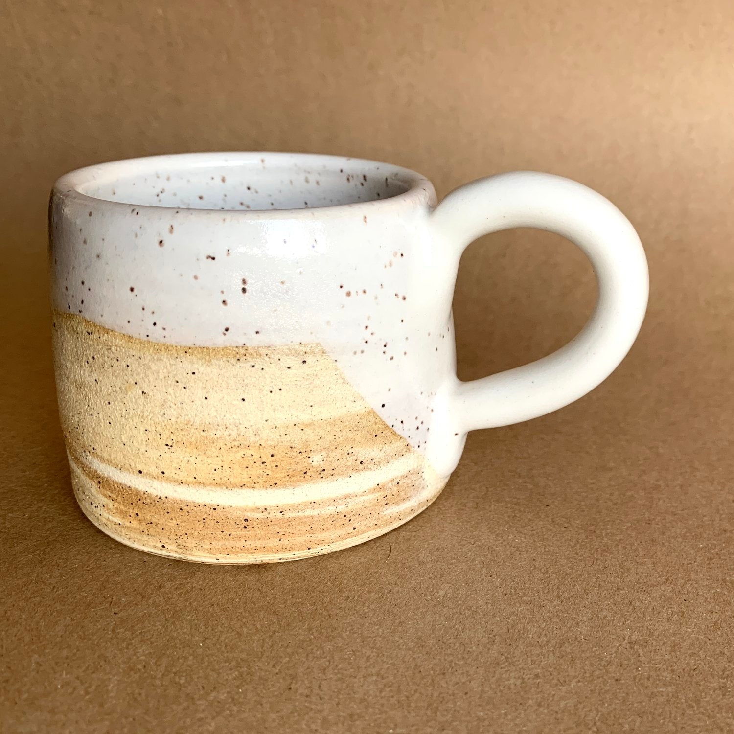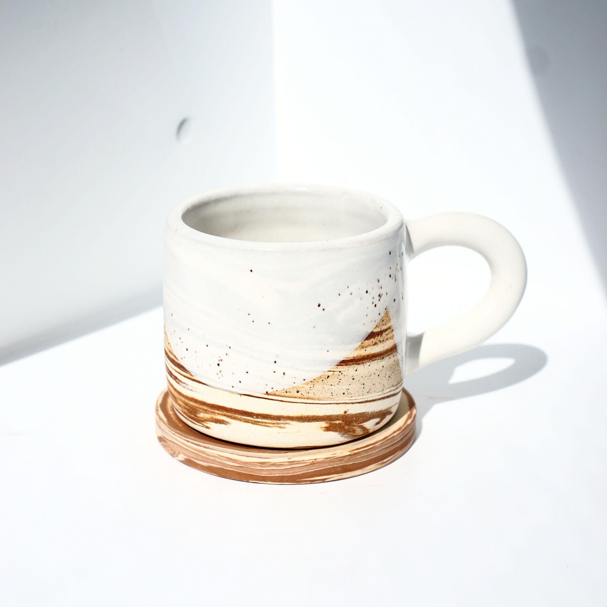 Featuring marbled ochre, white, and speckled clay with a gorgeous white gloss glaze.